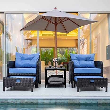 - [Luxurious & Comfortable] PAMAPIC’s 5-piece patio furniture set includes 2 single chairs, 2 ottomans and 1 coffee table. Chairs are ergonomically designed for more comfort with soft, sponge-padded cushions. Large ottomans provide you with a comfortable place to rest.