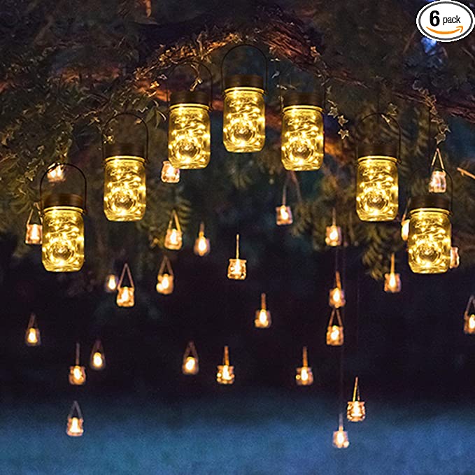 Solpex Solar Mason Jar Lights 30 LEDs, 6 Pack Fairy Hanging Solar Outdoor String Lights with Jars and Hangers, Waterproof Decorative Fairy Solar Lantern Lights for Garden Balcony Patio- Warm White
