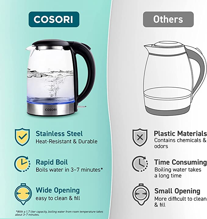 COSORI Electric Kettle with Stainless Steel Filter and Inner Lid, 1500W Wide Opening 1.7L Glass Tea Kettle & Hot Water Boiler, LED Indicator Auto Shut-Off & Boil-Dry Protection, BPA Free, Matte Black